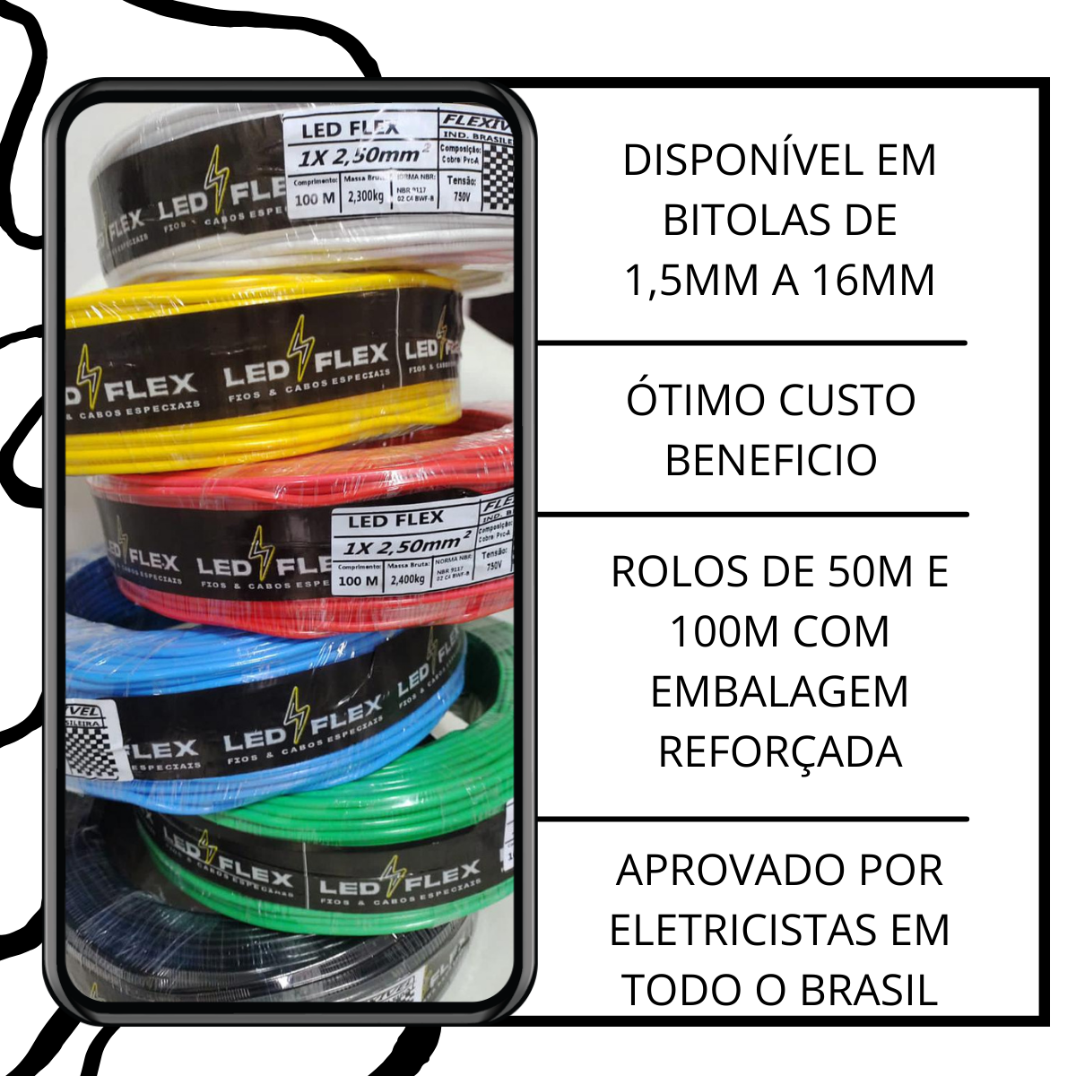 Os cabos LED FLEX são produzidos com condutor em Alucobre e seguem as principais normas técnicas brasileiras. Nossa linha entrega qualidade, durabilidade e o melhor custo-benefício do mercado, tornando-se a escolha ideal para quem busca produtos de alto giro e ótima margem.